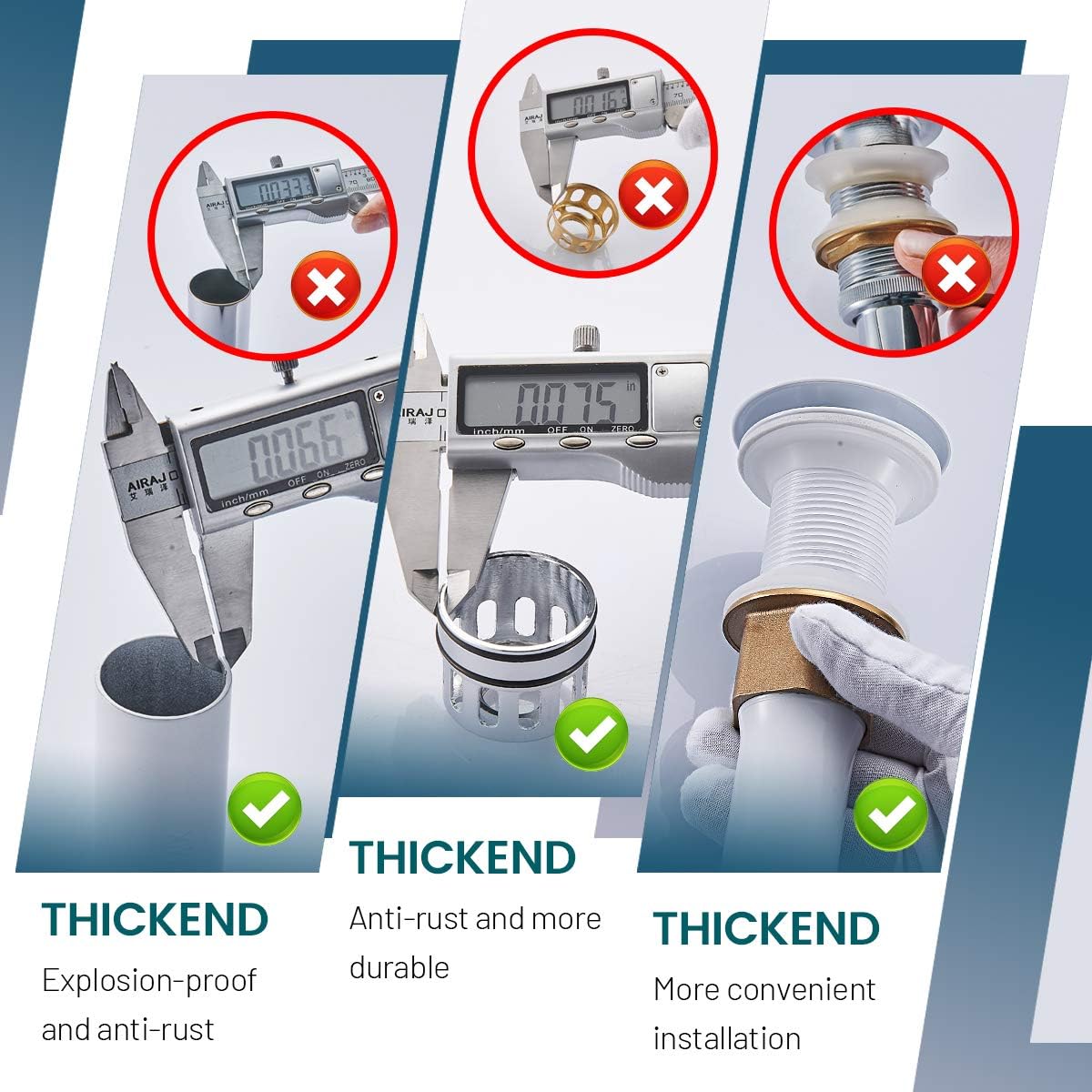 - 【EASY INSTALLATION】Anyone can install a pop up drain due to its simple construction,no tools required, the thickened and extended nut allow it to be mounted by bare hand.Fits standard american bathroom sink with 1-1/2" to 1-3/4 inch drain hole(1.45 to1.96 inches).