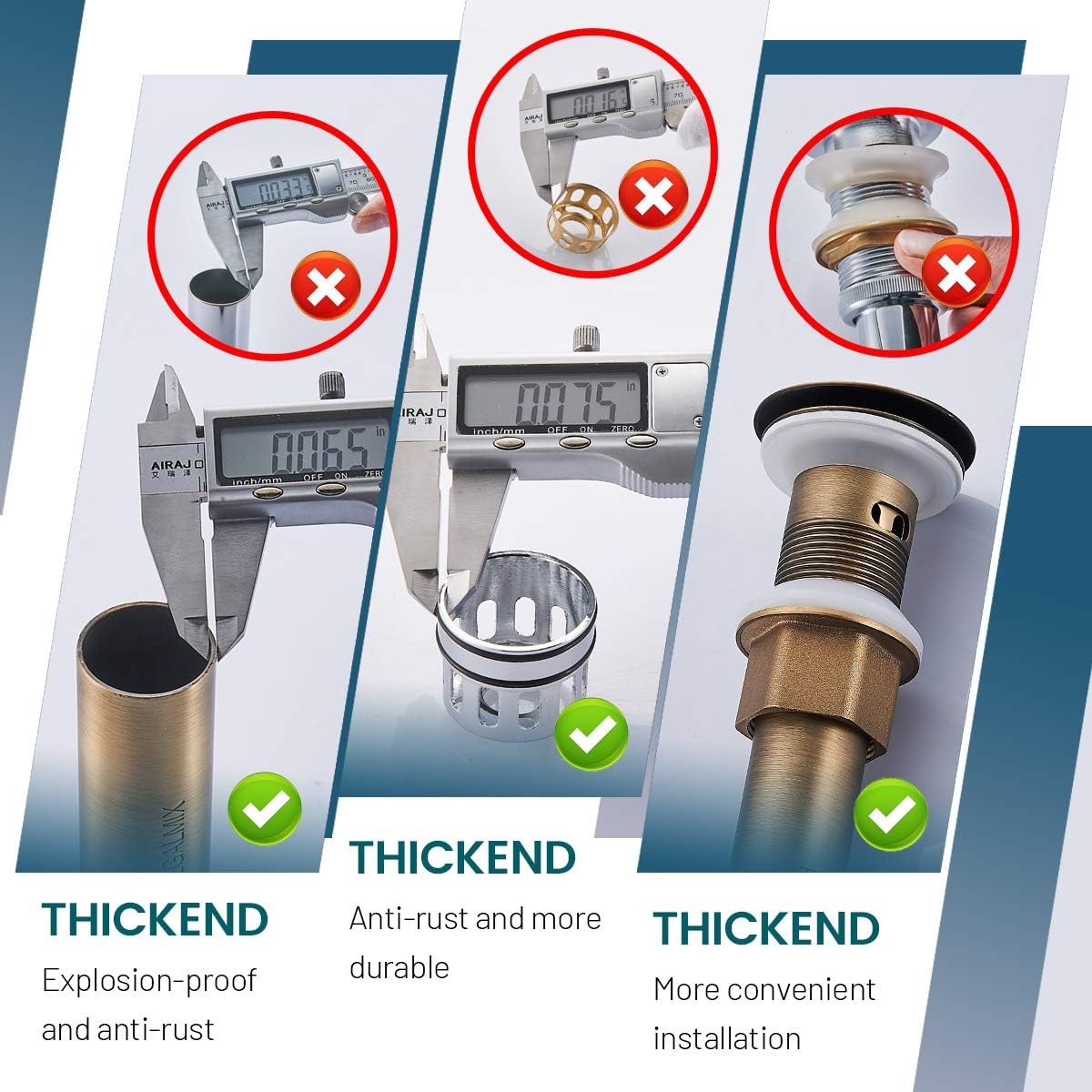- 【EASY INSTALLATION】Anyone can install a pop up drain due to its simple construction,no tools required, the thickened and extended nut allow it to be mounted by bare hand.Fits standard american bathroom sink with 1-1/2" to 1-3/4 inch drain hole(1.45 to1.96 inches).