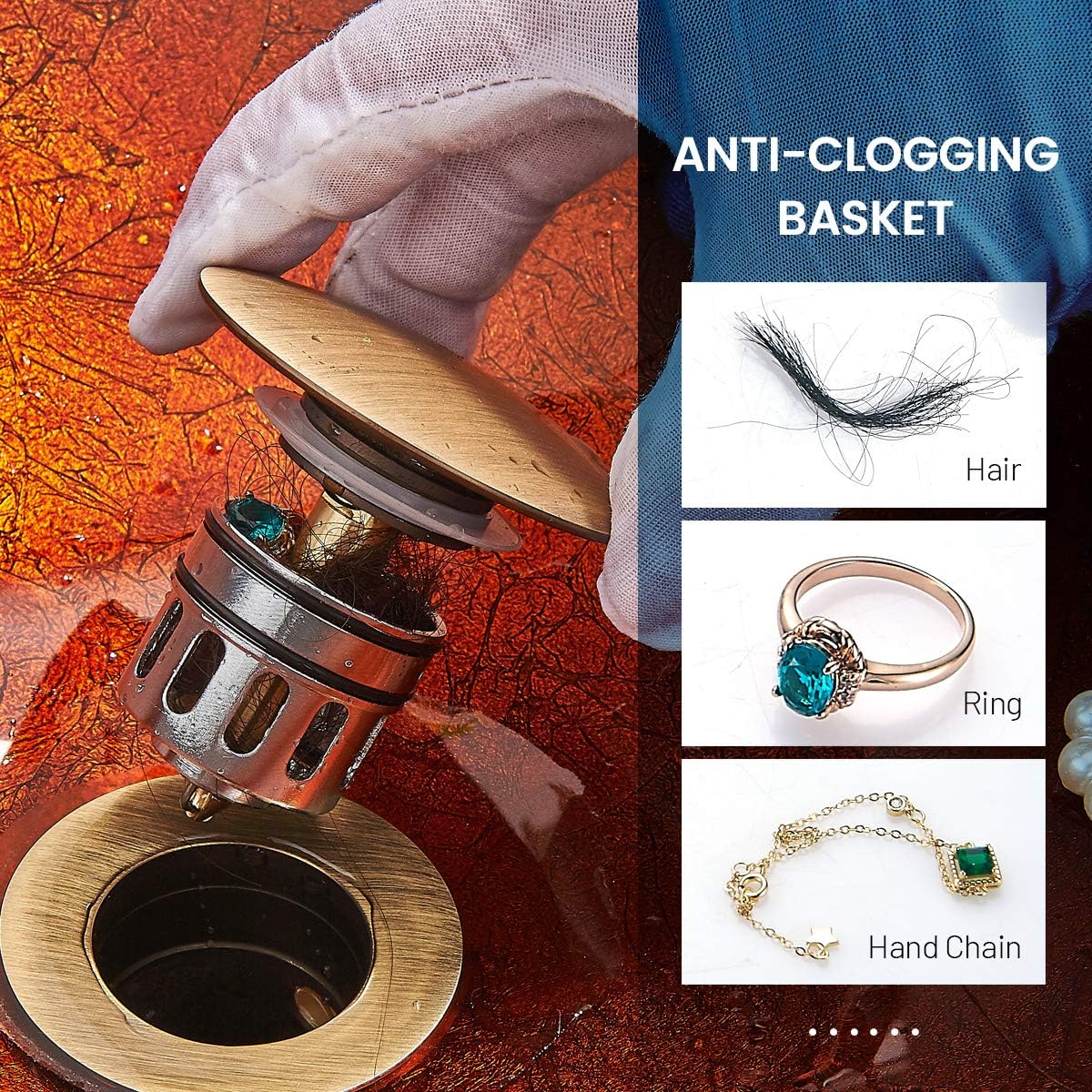 Antique Brass Pop UP Drain, Bathroom Vessel Lavatory Vanity Faucet Sink Stopper, Built-in Anti-Clogging Strainer, Fits Standard American Drain Hole(1-1/2" to 1-3/4"),Without Overflow RWF082S
