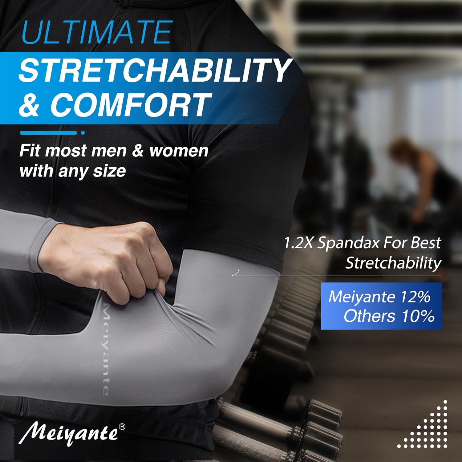 • [ULTIMATE STRETCHABILITY & COMFORT] Say goodbye to arm sleeves that cut off circulation or constantly roll down your arms with Meiyante's cooling arm sleeves for women & men. Featuring a stitchless design and DOUBLE THE AMOUNT OF SPANDEX COMPARED TO OTHER TOP-RATED ARM SLEEVES ON AMAZON, our arm sleeves provide superior stretch and comfort, making them perfect for sun protection, sports, exercise, and covering tattoos at work. Our arm sleeves ensures long-lasting wear and use.
