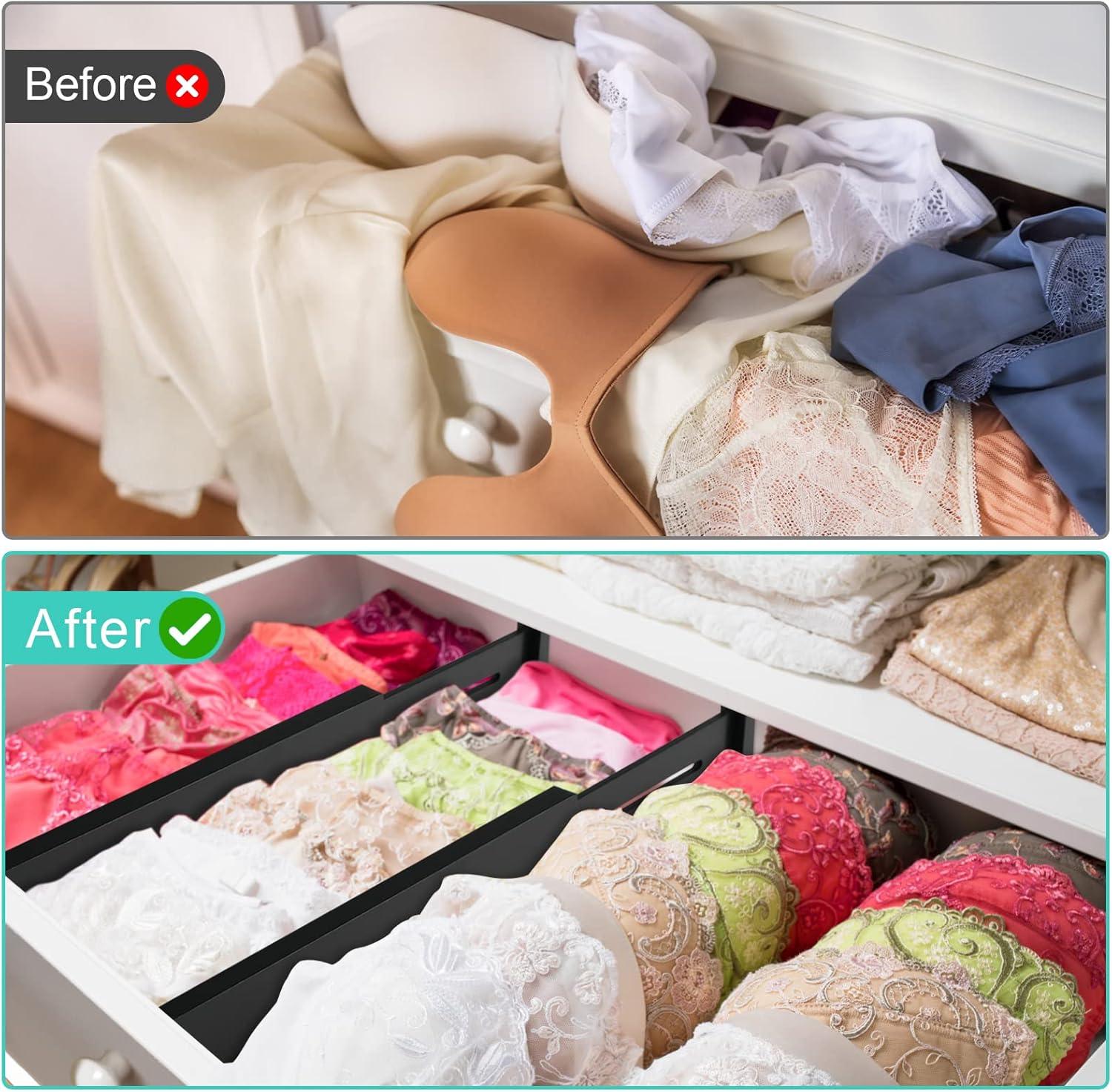 - Adjustable Drawer Dividers: Adjustable drawer dividers range from 11.8-17 inches in length; fits easily in most drawers to keep your belongings organized and easy to access