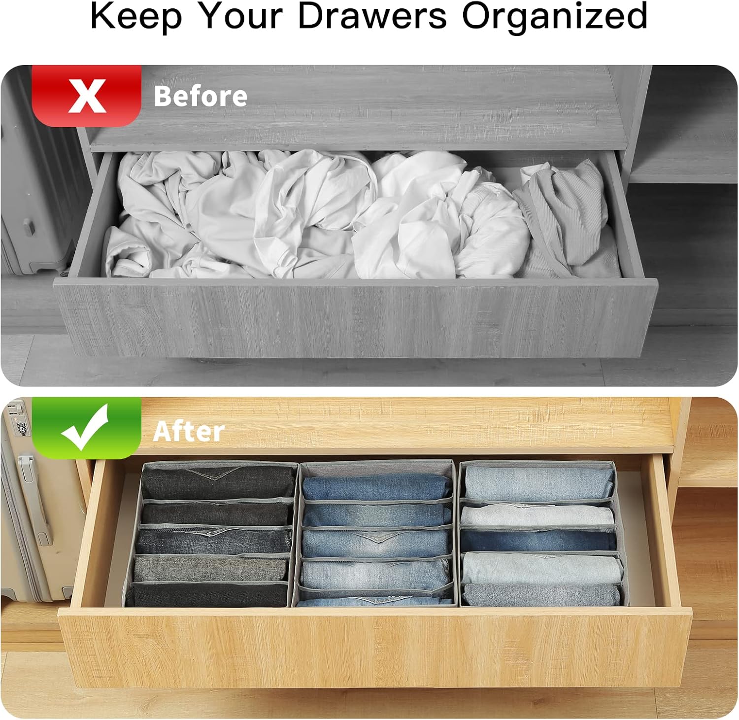 - PREMIUM QUALITY MATERIAL: The drawer organizer bins are made of tear-resistant and scratch-resistant high-quality fabric, with the sturdy thick board, which can keep its shape well and is not easy to deform when stacked. Very durable!