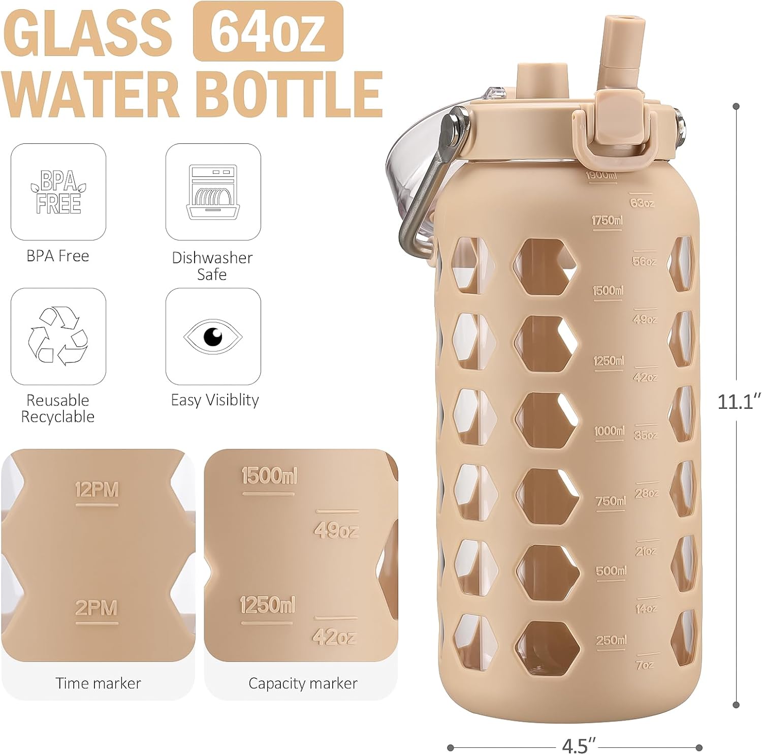 MUKOKO 64oz Glass Water Bottles with Straw and Lid,Half Gallon Water Bottle with Time Marker,Large Glass Water Jug with Silicone Sleeve and Stainless Steel Handle-Amber