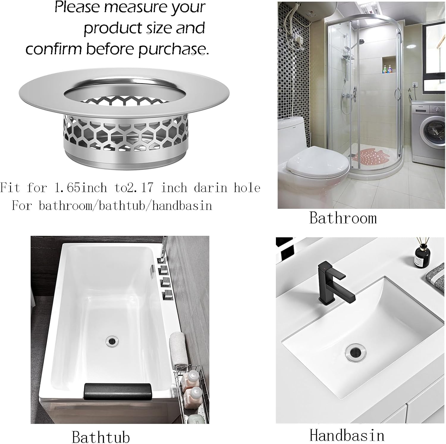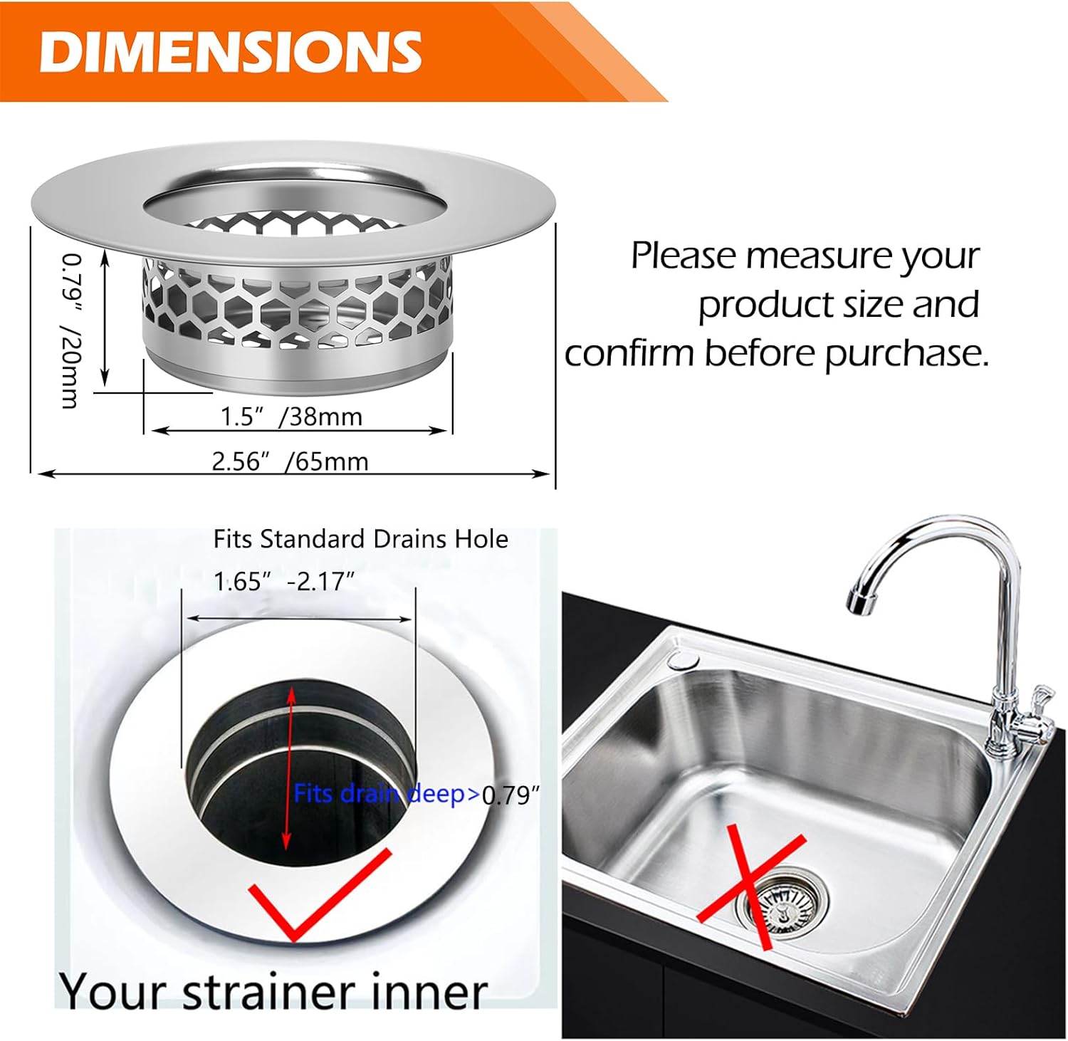 - PERFECT SIZE: Outer Diameter 2.56 inch/65mm, Inner Diameter 1.5inch/38mm, Depth 0.79 inch/20mm. this strainer is great for 1.65" -2.17"drain. PLEASE CAREFULLY CHECK THE DIAMETER OF YOUR DRAIN SIZE BEFORE YOU PURCHASE.