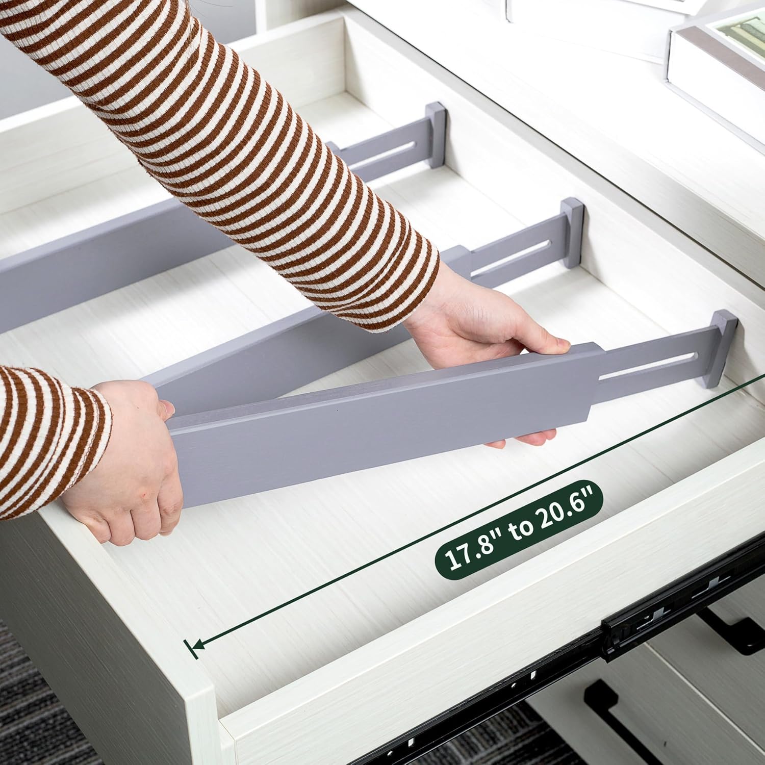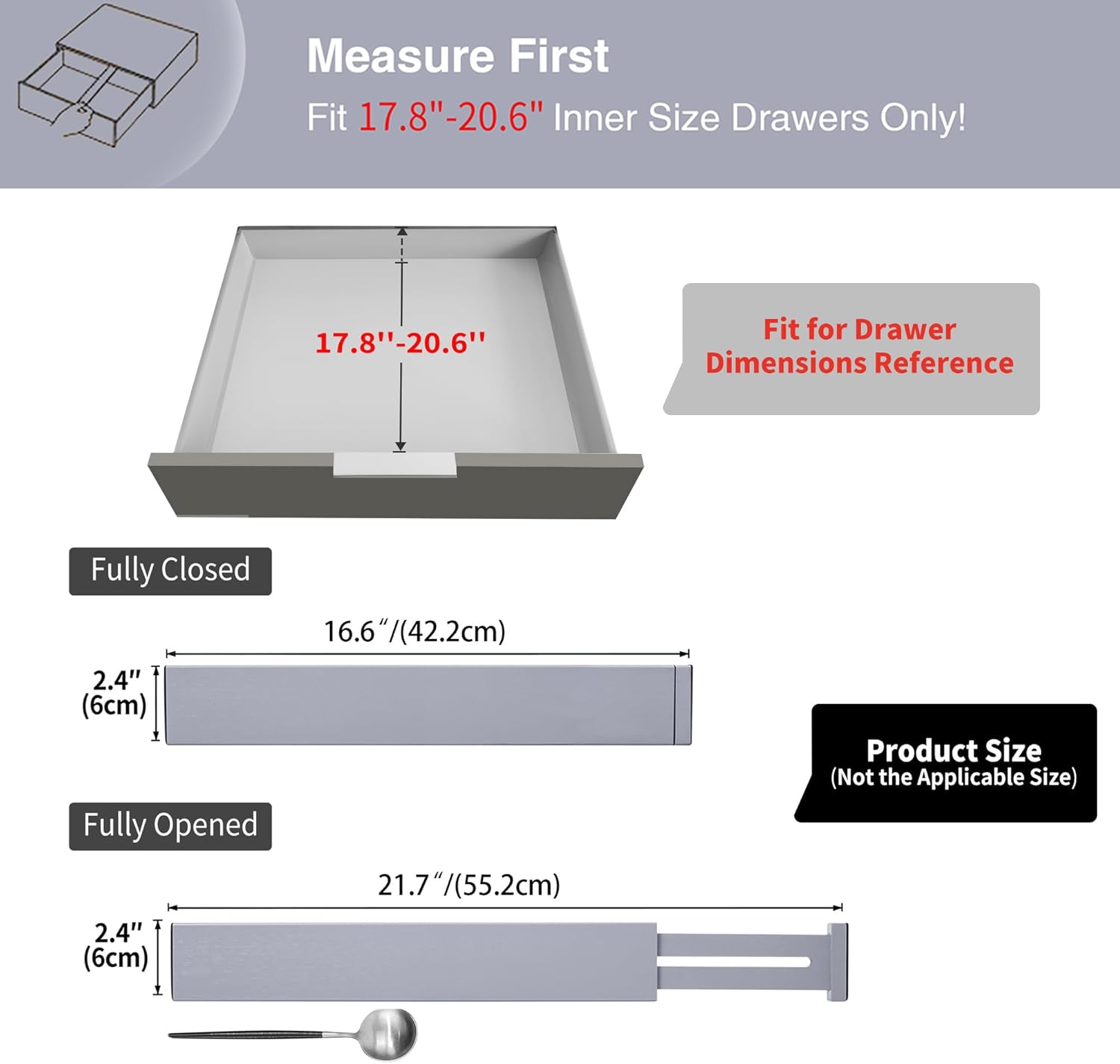 - Recommend Drawer Dimension: **Measure Your Drawers Before Buying!** This product is designed for drawers with an inner size of 17.8" to 20.6". If your drawer's inner size exceeds 20.6", it will doesn't work