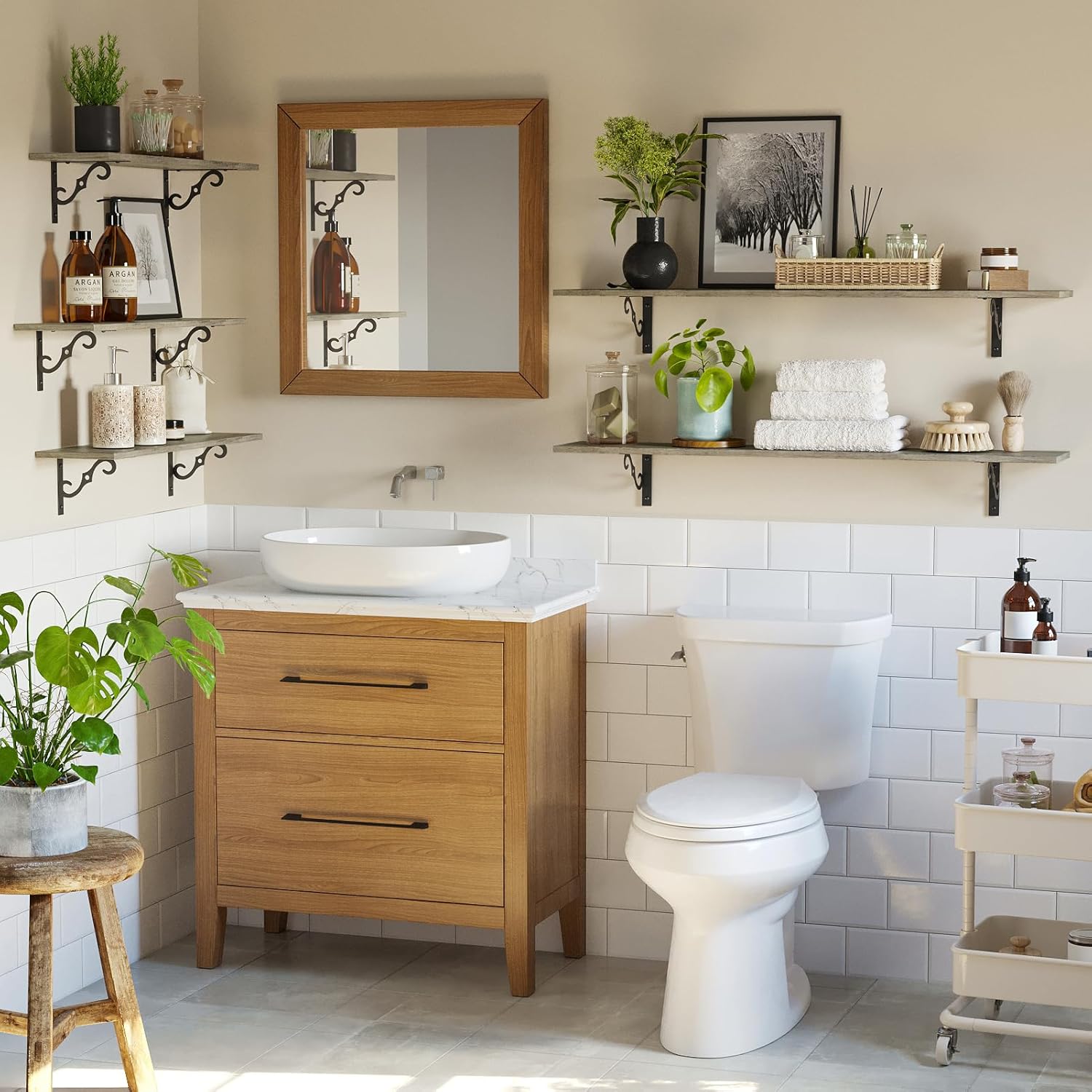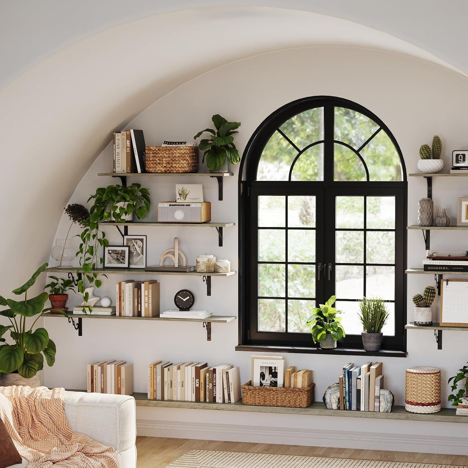 - ăAdd Finishing Touch to SpaceăMid-century design adds a retro-chic vibe to your home. Rusticity wood grain and exquisite S-shaped iron brackets flaunt visual interest and romance. They are full of character and enhance the texture of the space. A classy way to display your beloved decorations