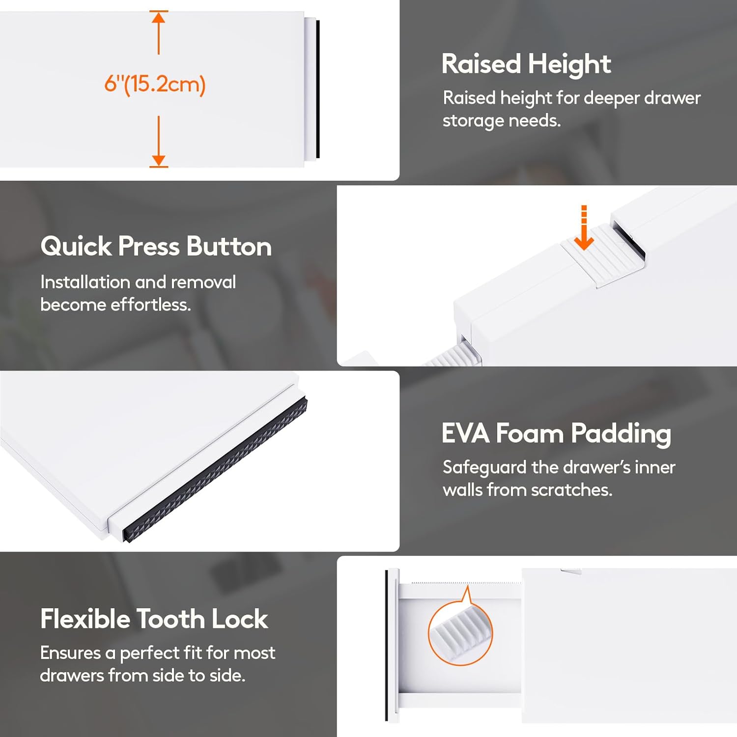 - Advanced Design: Our dresser organizer is made from stable ABS material and has high-quality EVA foam sponges at the ends to prevent scratches and damage to drawer walls, leaving no trace or residue. Additionally, our divider is patented (Patent No: US12133593B2) for a unique experience.