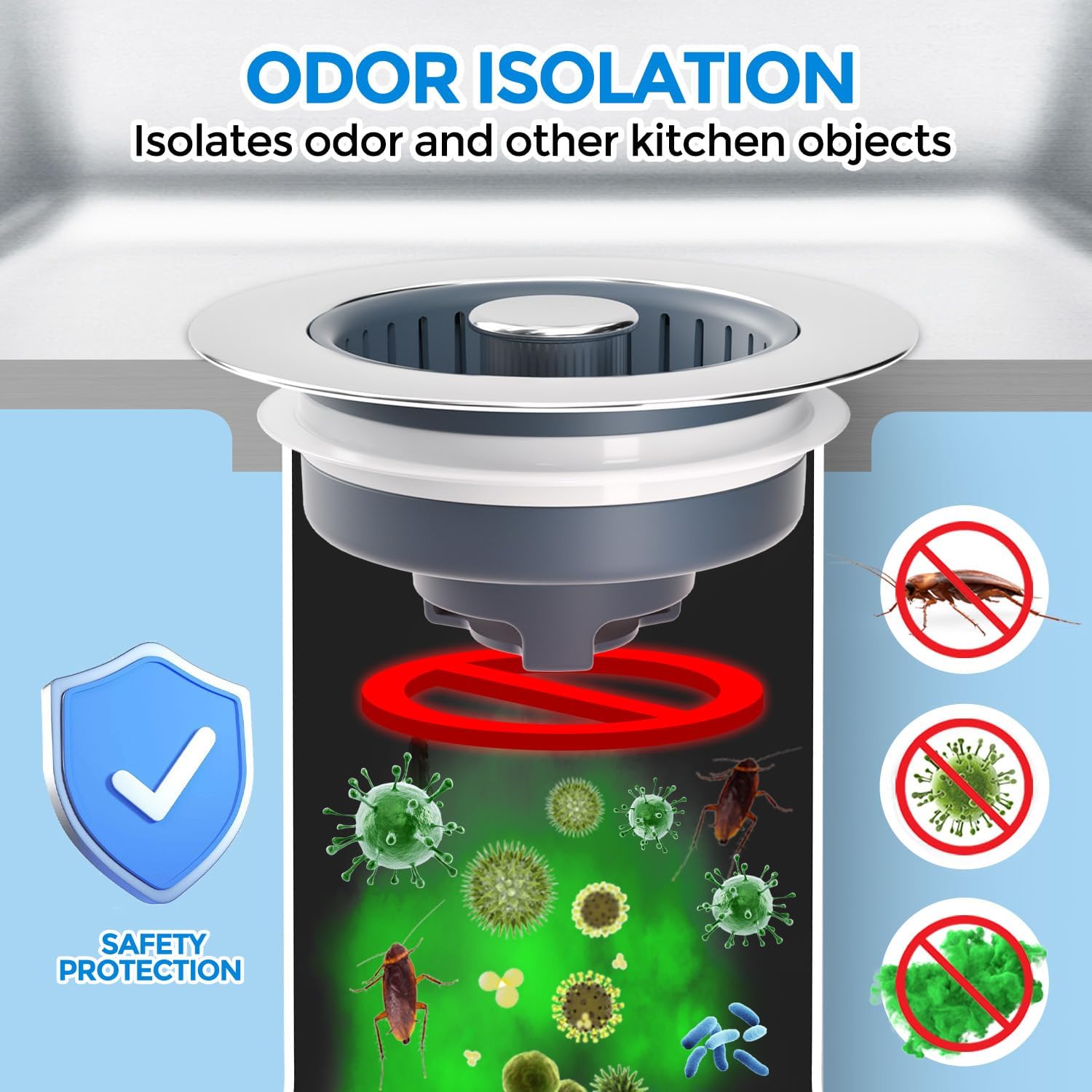 - 【Upgraded 3 in 1 Kitchen Sink Drain Strainer】Our kitchen sink strainer, combines sink drain strainer, kitchen sink stopper and odor isolation together. Press down the pop up button to store water for washing, press again to drain water while catching food waste or scrap from going down the drain. A reliable anti clogging helper.