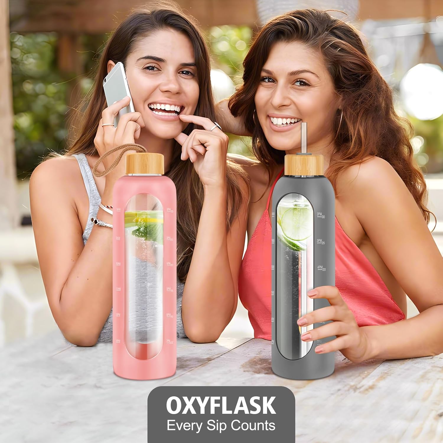 Glass Water Bottles 32 oz - Motivational Drinking Glass Water Bottle with Silicone Sleeve, Straw & 2 Bamboo Lids - 1 Liter Clear Borosilicate Daily Intake Tumbler with Time Marker - Grey