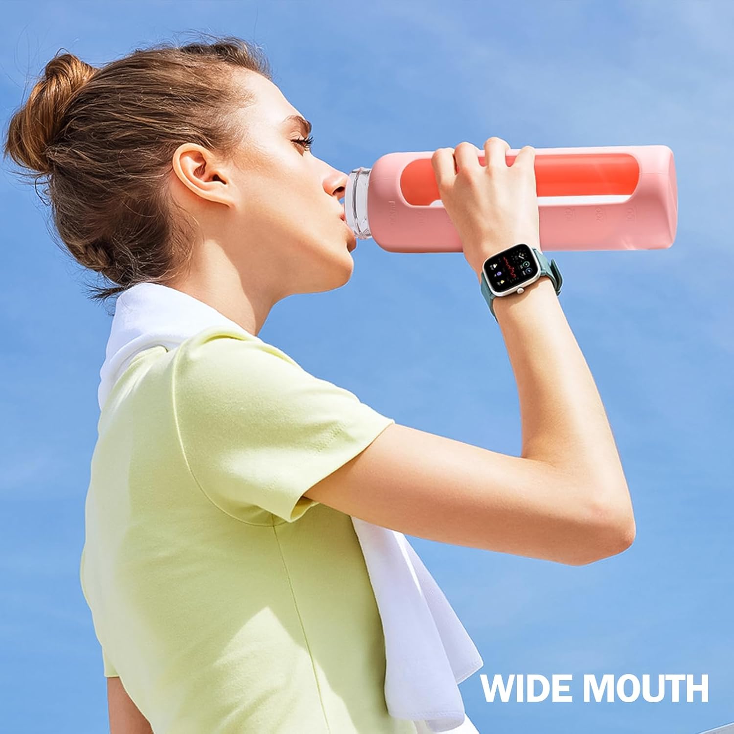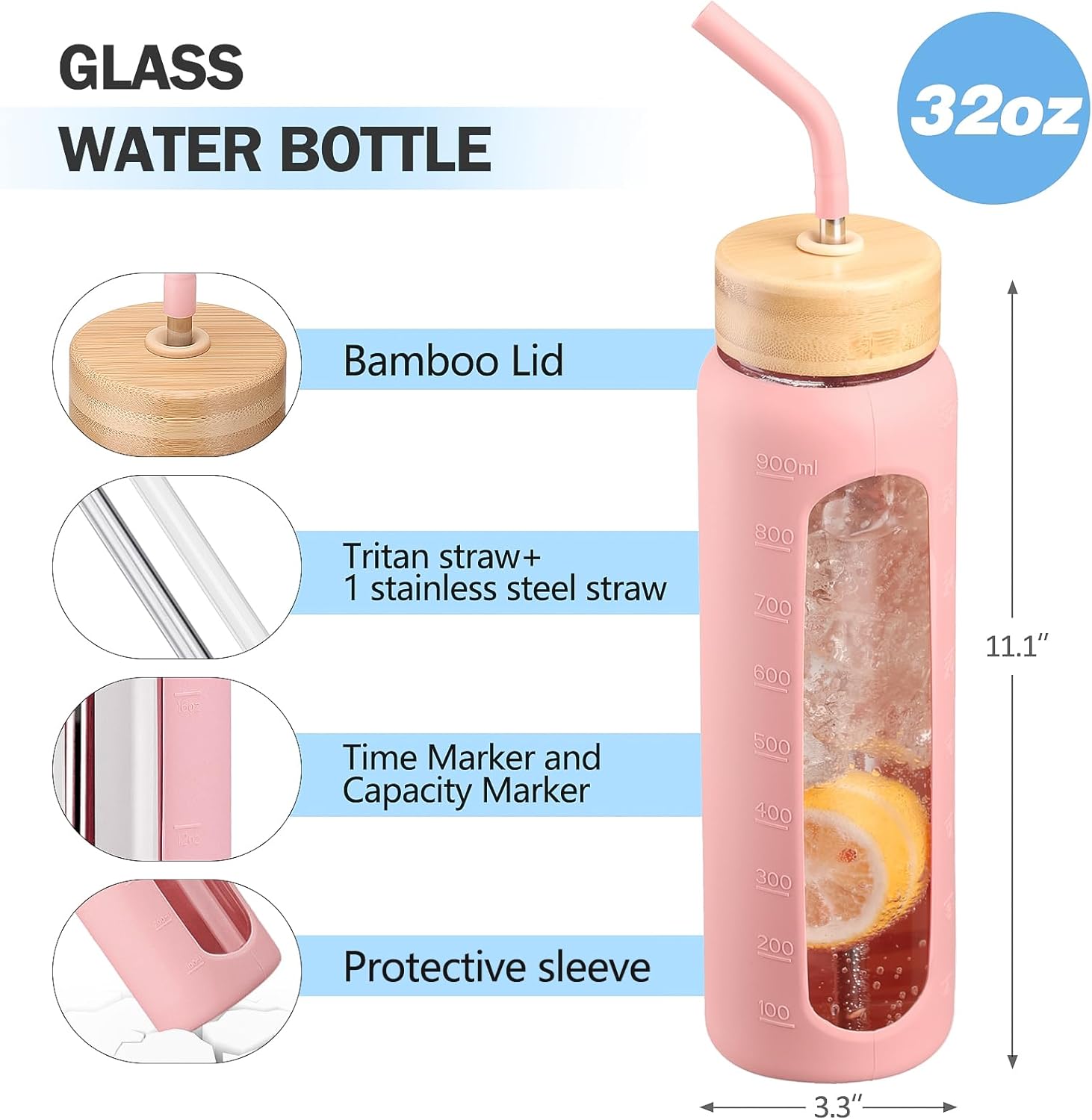 - HIGH-QUALITY & 100% BPA FREE - Our borosilicate glass water bottle is free from BPA, BPS, PVC, and lead. The stylish silicone sleeve adds extra protection against slips and falls. It is suitable for both hot and cold beverages (-4°F to 302°F). The wide-mouth design makes it easy to fill with ice cubes and fruits, and easy to clean daily.