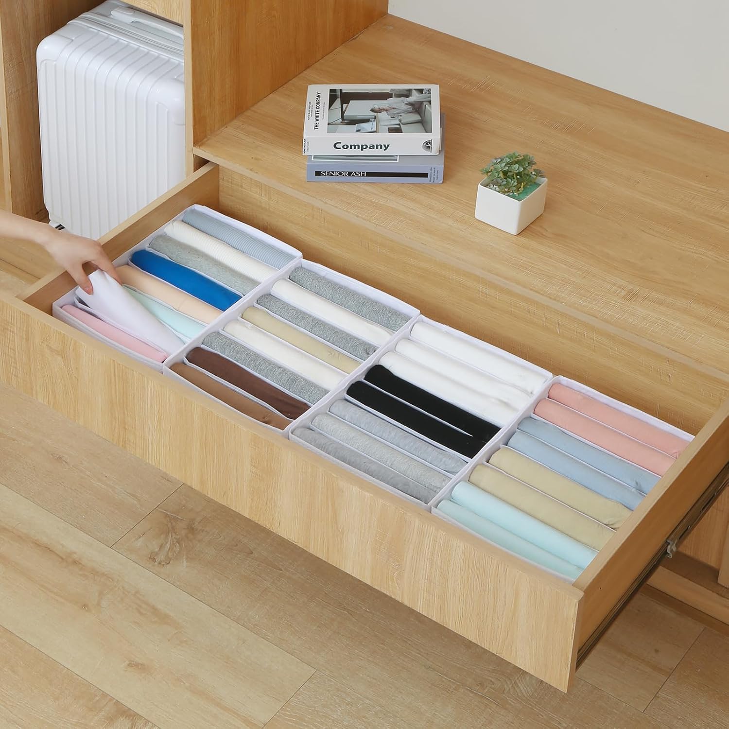 - PREMIUM QUALITY MATERIAL: The clothes organizer for folded clothes are made of PBT fabric, which is moisture-proof and very durable. The square boards are made of PP (Polypropylene), which is high heat-proof, smooth and light. These drawer organizers for clothing are washable, but the fabric contains a hard PP board, so please wash them by hand instead of using the machine.