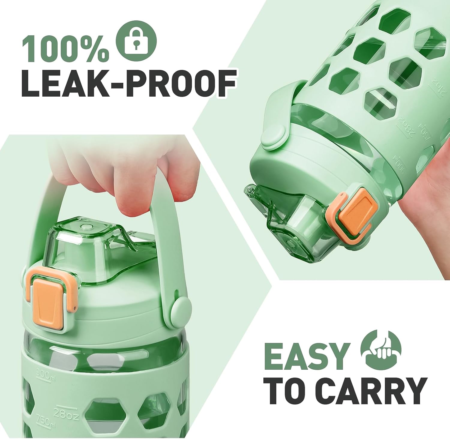 MUKOKO 32 oz Glass Tumbler with Straw,Glass Water Bottles with Time Marker,Iced Coffee Cup with 2 Lids-Handle Spout Lid&Straw Lid,Silicone Sleeve,Leakproof,1 Pack-Green