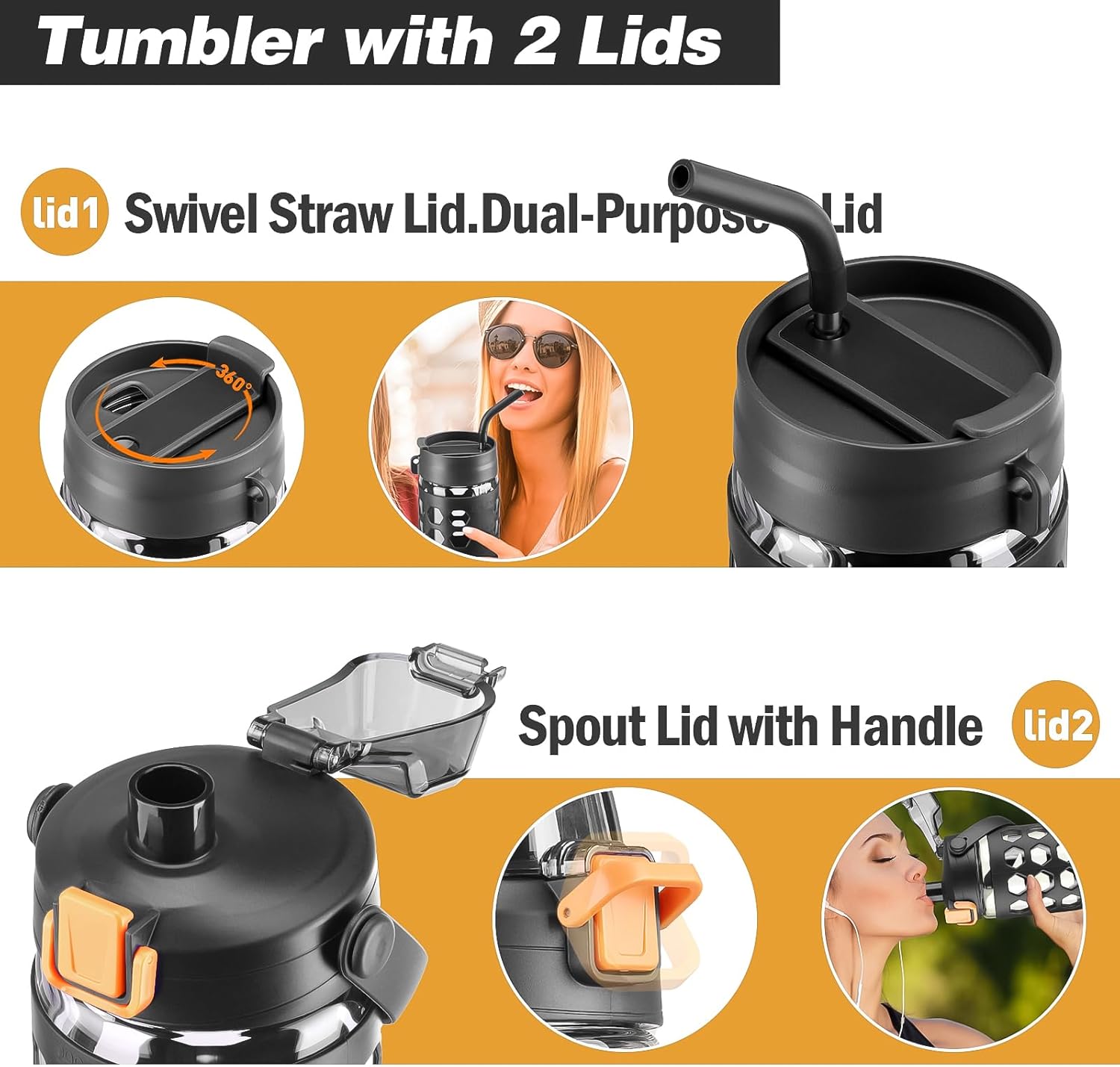 - TWO LID DESIGNS:Whether you prefer small sips or maximum thirst quenching.-Straw lid.Swivel lid with three positions: straw opening designed to prevent splashing and seals to hold reusable straws in place,beverage opening for straight sipping,full lid top for added leakage protection.-Leak-proof spout handle lid.The spout enables smooth liquid flow and the handle attached to the lid allows for easy carrying on the go.Suitable for gym and outdoors.