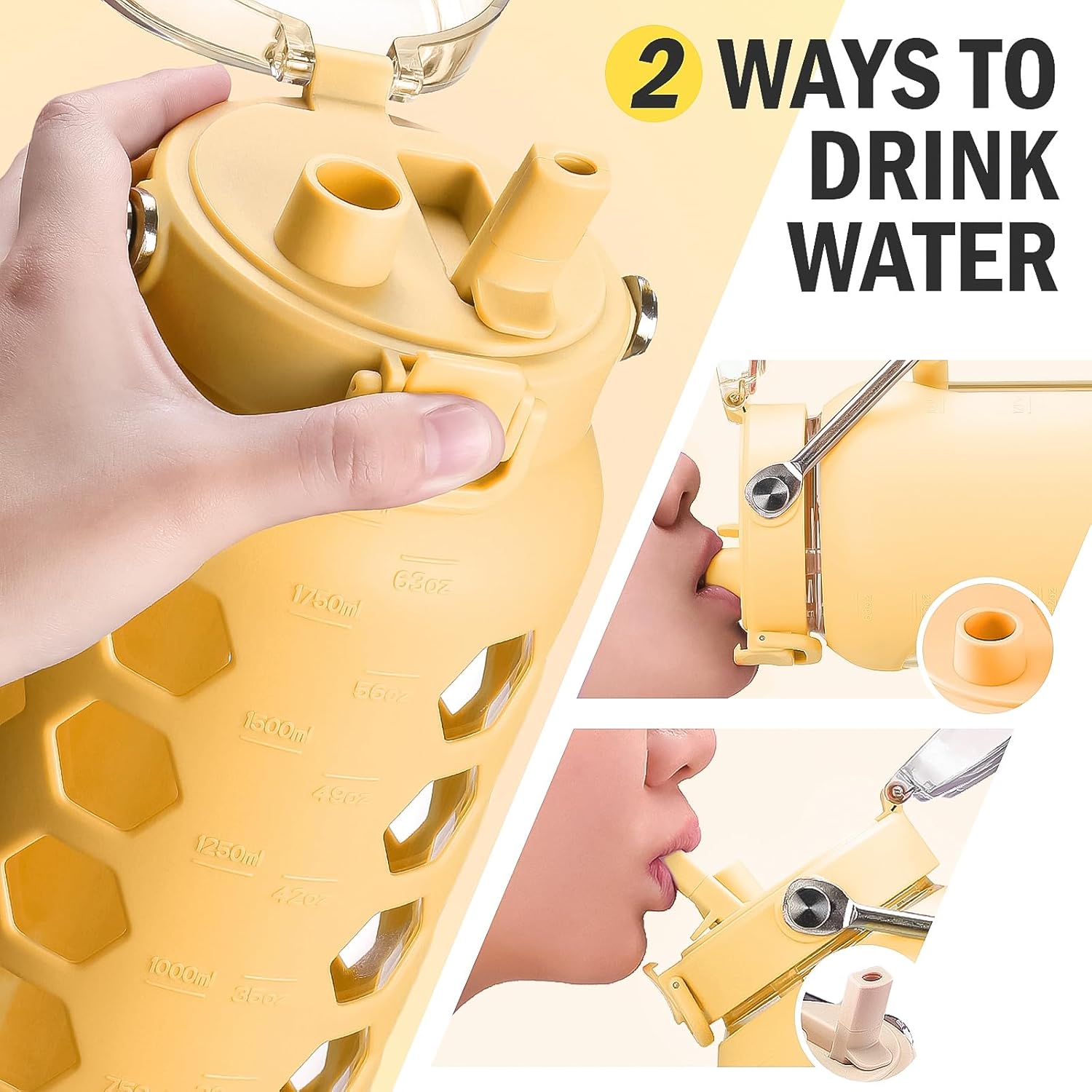 MUKOKO 64oz Glass Water Bottles with Straw and Lid,Half Gallon Water Bottle with Time Marker,Large Glass Water Jug with Silicone Sleeve and Stainless Steel Handle-Yellow