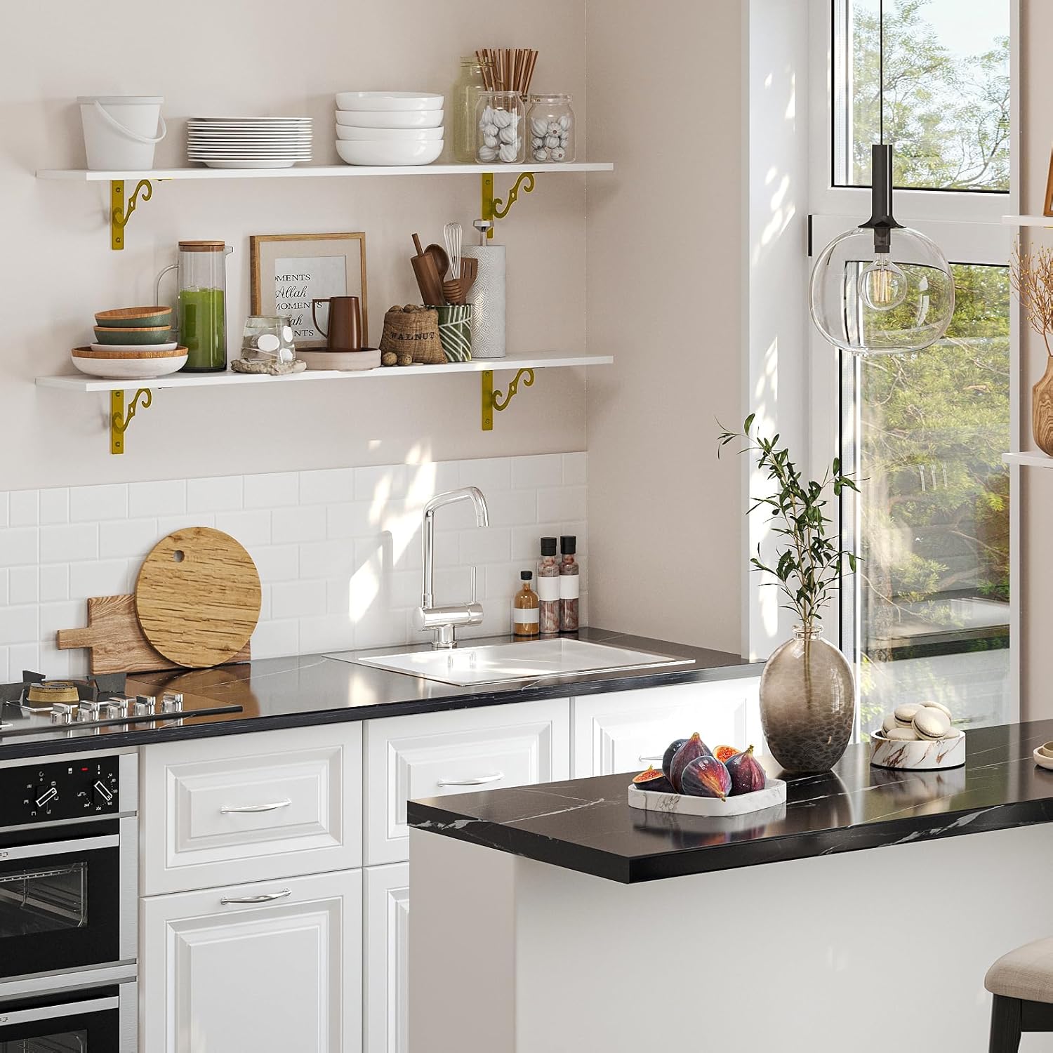 DINZI LVJ Long Wall Shelves, 31.5" Wall Mounted Shelves Set of 4, Wide Floating Shelf for Wall with Metal Brackets, for Living Room, Bathroom, Bedroom, Kitchen, Office, White and Gold