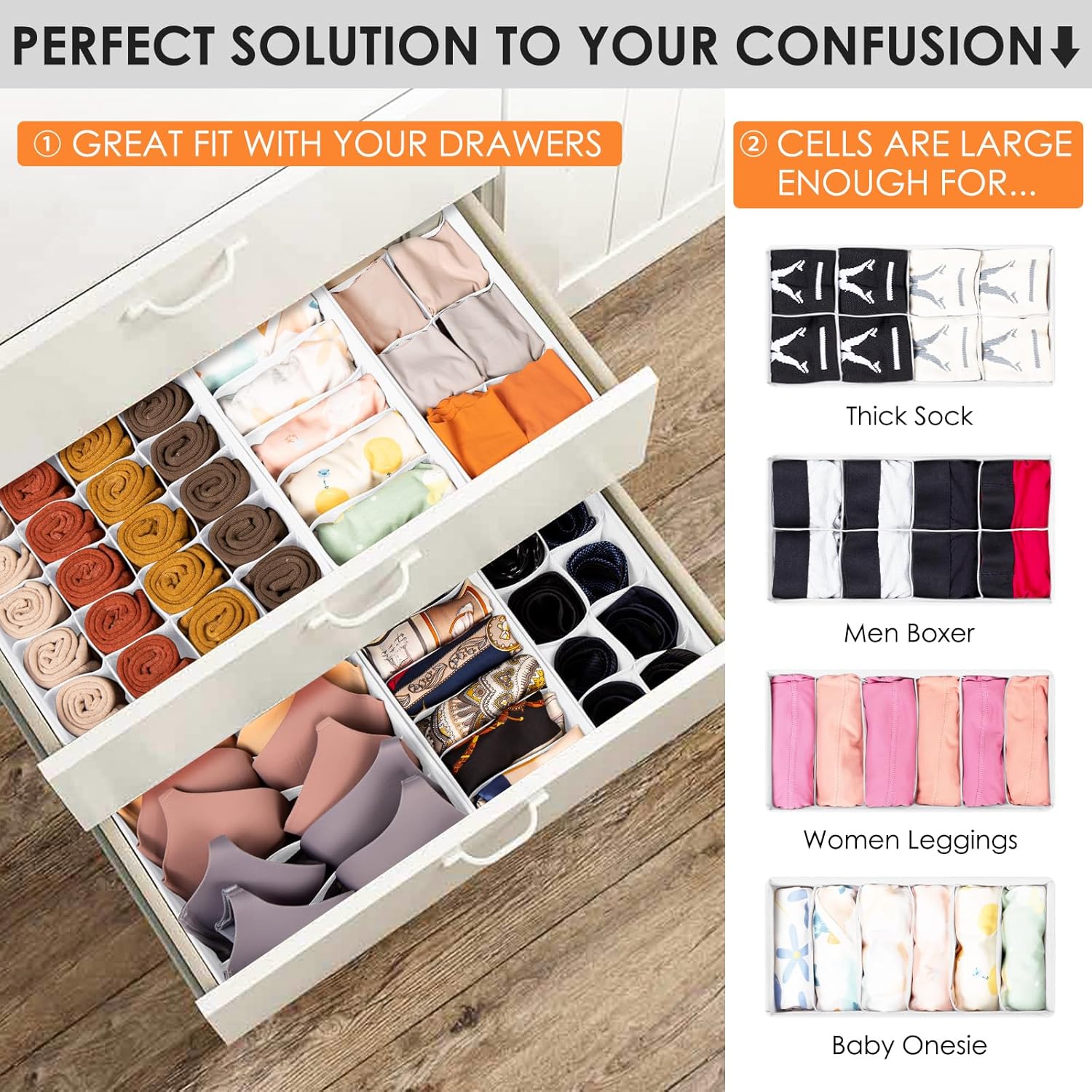 - ăCOMPARTMENTS FOR MULTI STORAGE USEăCompared to others, our 16 pack drawer organizer set has 5 sizes for various storage needs. No matter it's knee sock, men boxer brief, or women leggings, they will all perfectly fit into our clothes organizer. Great for bedroom organization and dorm room storage.