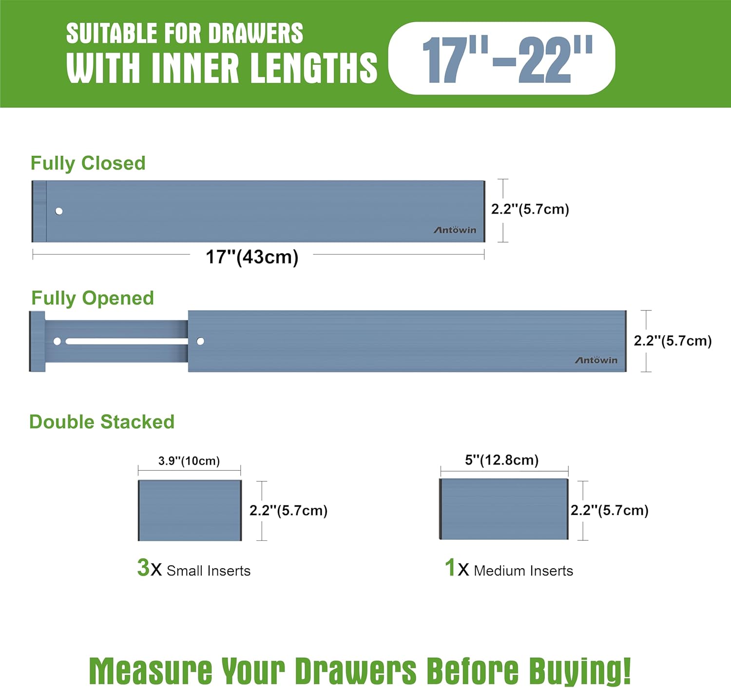 - Expandable Drawer Organizer: Each Measures 17" x 2.36" x 0.6" ; Expands from 17" to 22" long. 3 pcs Small drawer divider Measures 3.7" x 2.36" x 0.5" .
