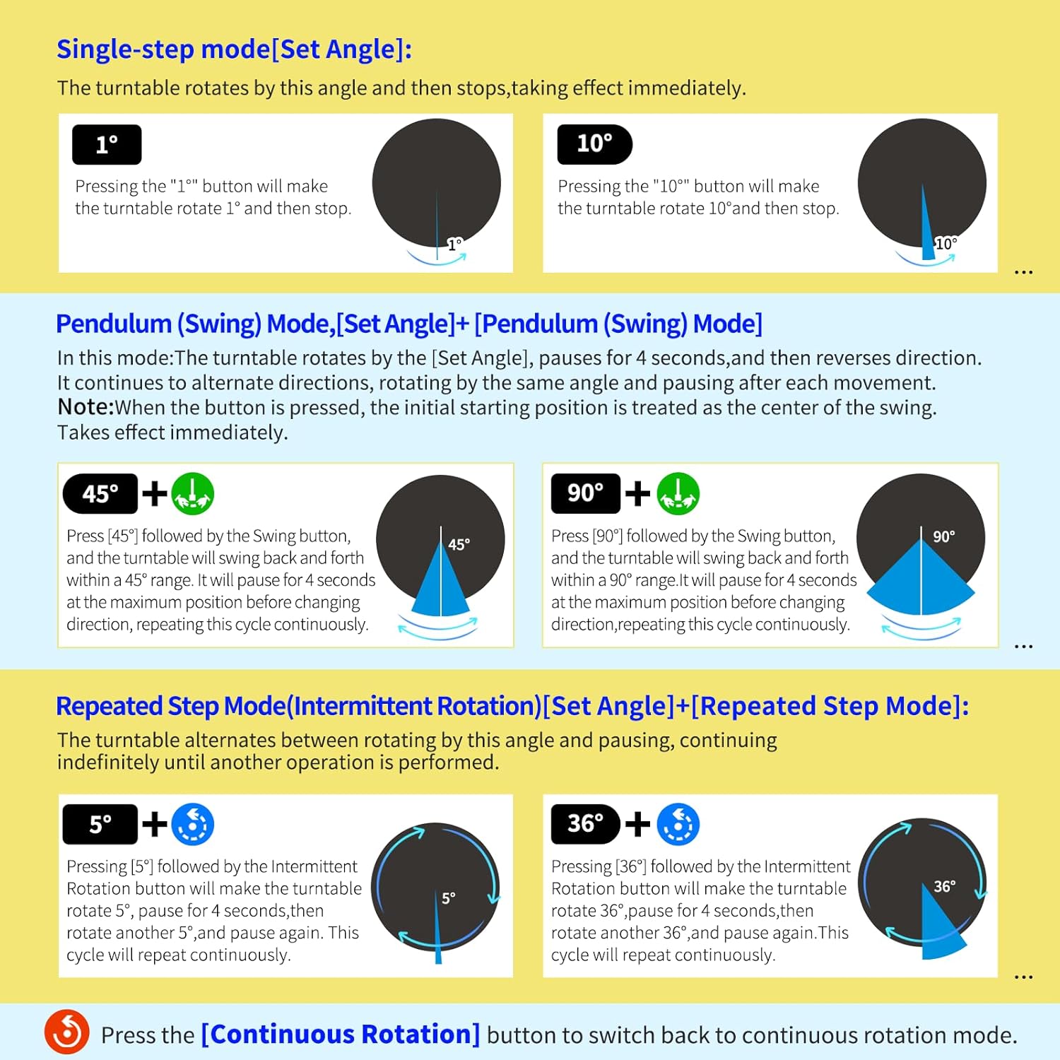 - 【The motorized turntable Supports five rotation modes】: 【Continuous Rotation Mode】for Live Video Show.【Single-Step Mode】for Product Display and Live Demonstration.【Repeated Step Mode】 for Automated Product Display .【Multi-step Within One Circle Mode】for 360-Degree Multi-Angle Photography and 3D Scanning. 【Pendulum (Swing) Mode】 for Automatic Multi-Angle Front-and-Back Product Display. The intelligent multi-step within one circle mode makes shooting more streamlined and automated