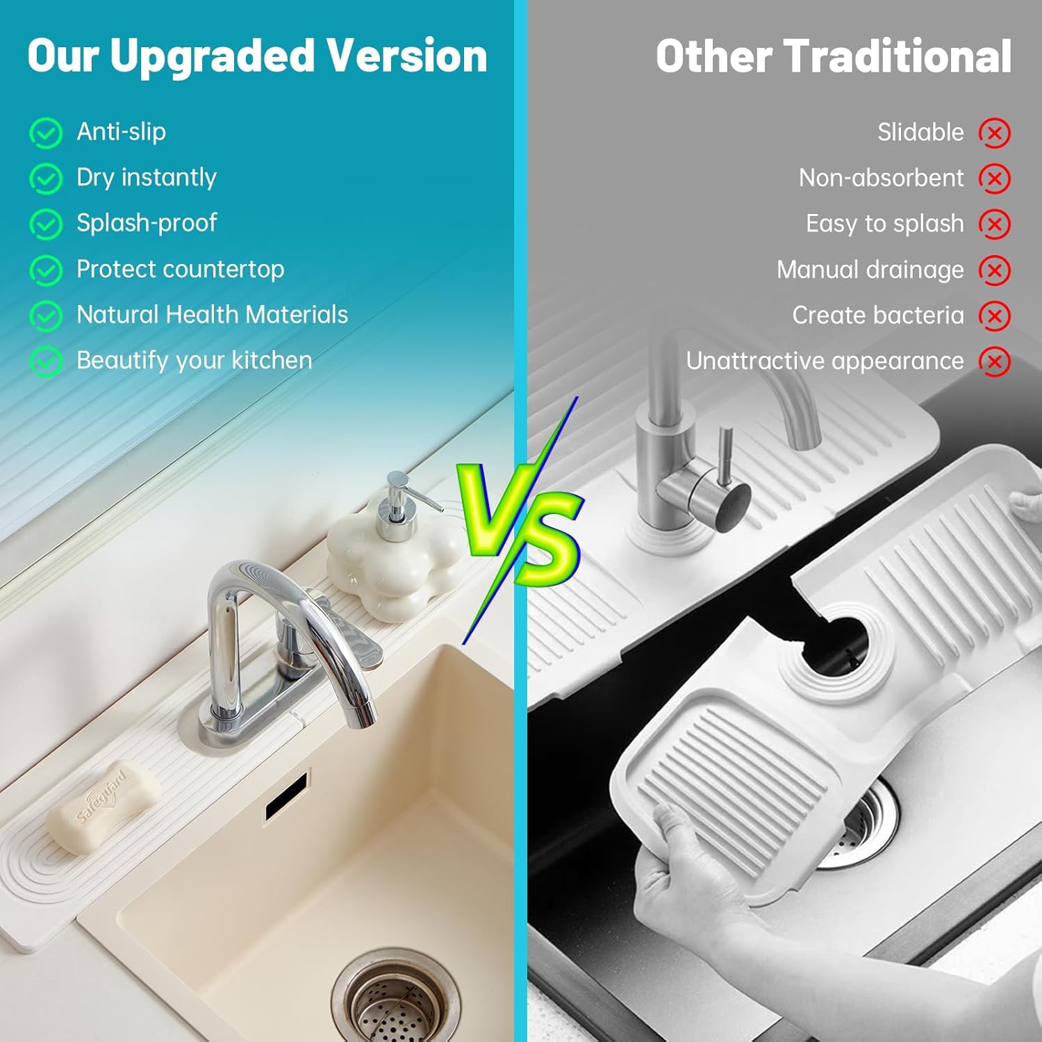 - Neat countertop: This versatile faucet mat is perfect for both your kitchen and bathroom. In the kitchen, it provides a convenient spot for your dishwashing sponges, soap, and small accessories. In the bathroom, it can hold toothbrushes, hand sanitizer, cups, and other essentials, helping you maintain a neat and clutter-free space.