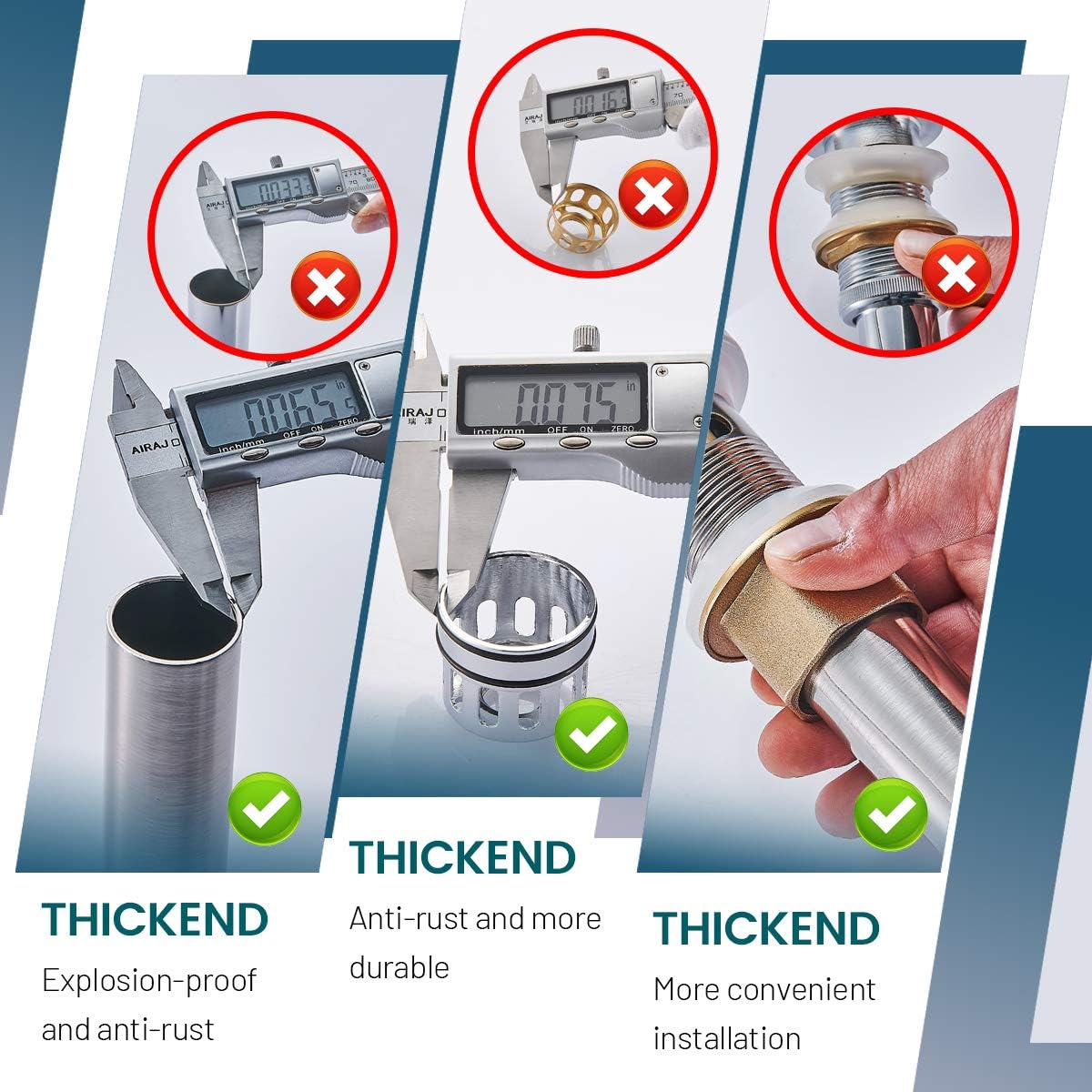 - 【EASY INSTALLATION】Anyone can install a pop up drain due to its simple construction,no tools required, the thickened and extended nut allow it to be mounted by bare hand.